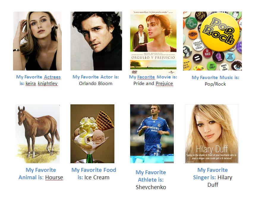I love music, reading, clumbing, drawing, surfing the net, studying English, talking on the phone with my friends. My favorite food is burger and I like ice cream very much.The most important to me is my family , my country and my dog. I also enjoy going out with my friends.
